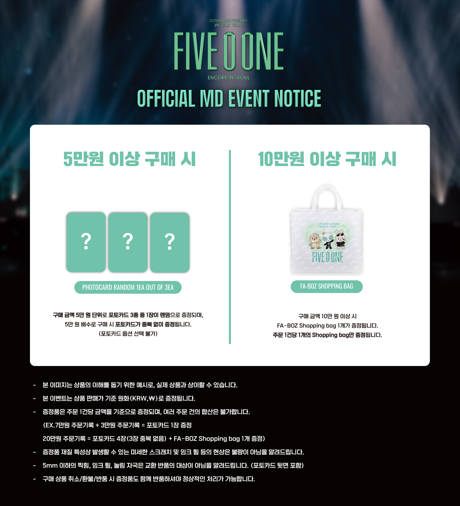 EX. 단일 주문 예시 : 20만원 주문기록 = 포토카드 4장(3장 중복 없음) + FA-BOZ Shopping bag 1개 증정